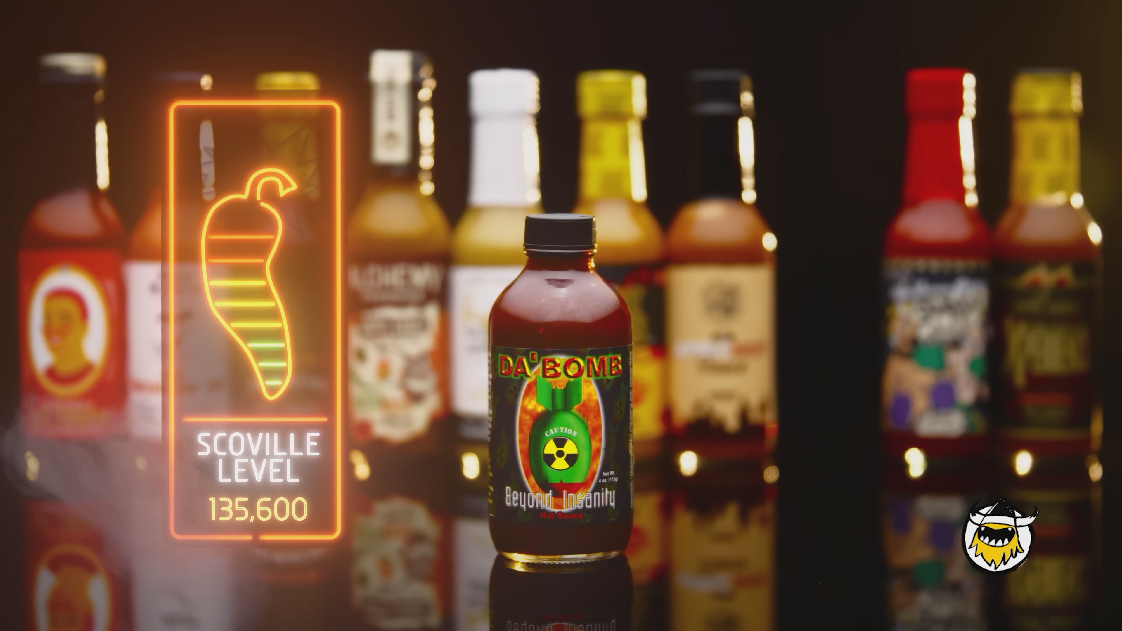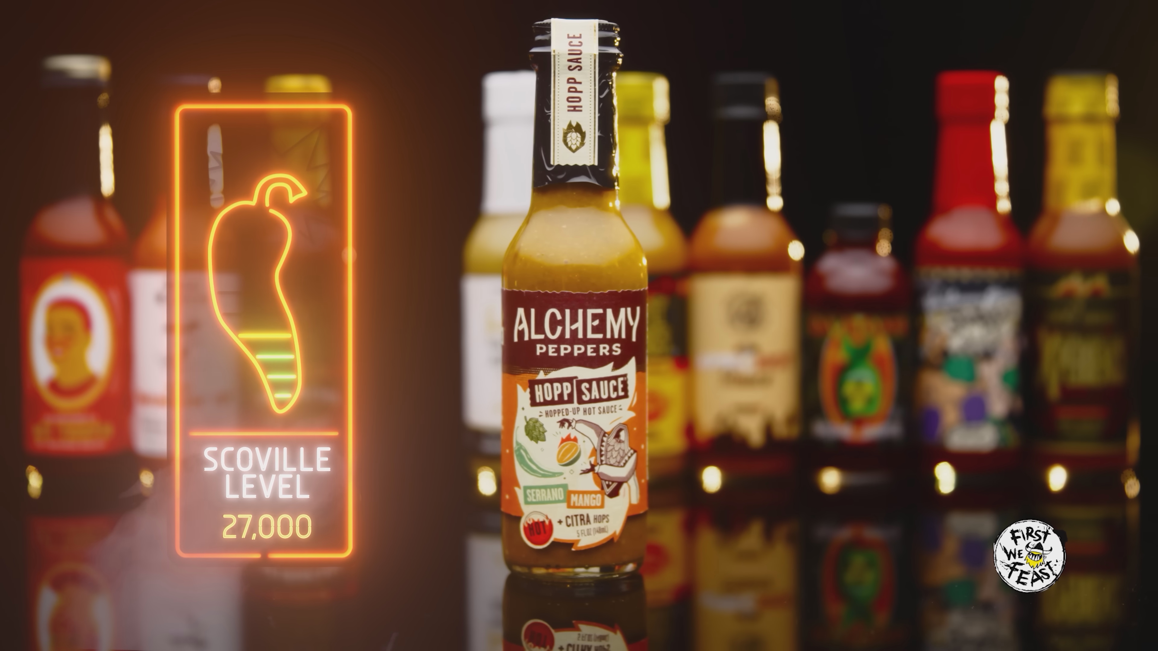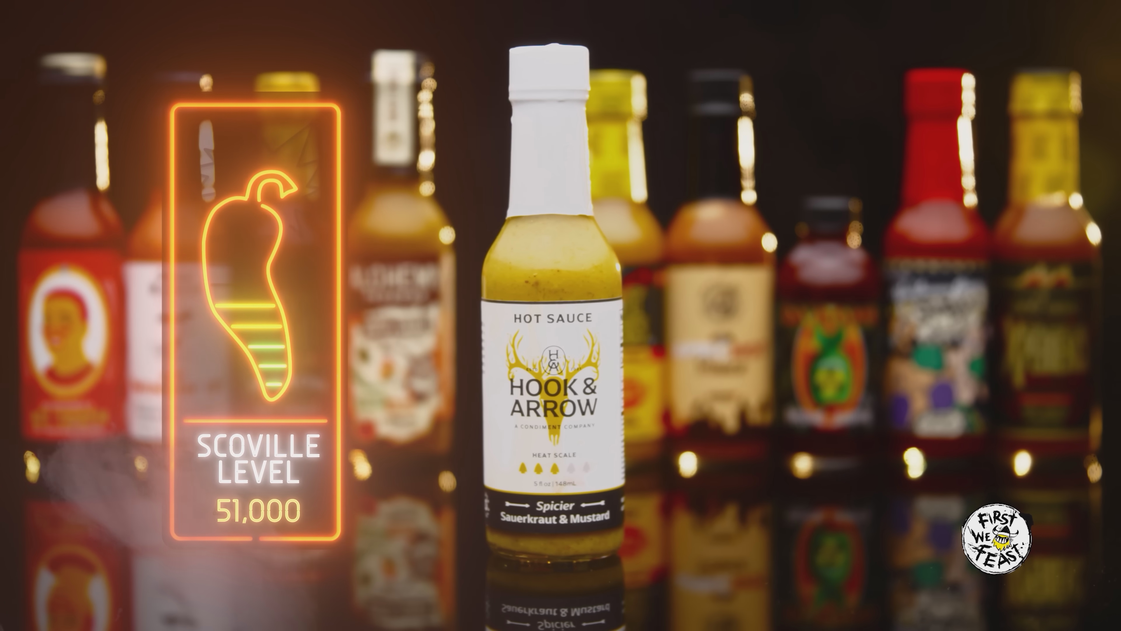 The camera widens. Two rows of wings stand between them, starting with harmless amber glazes and ending in glistening reds that promise trouble. Studio lights catch the slick surfaces, making each one look hotter than the last.