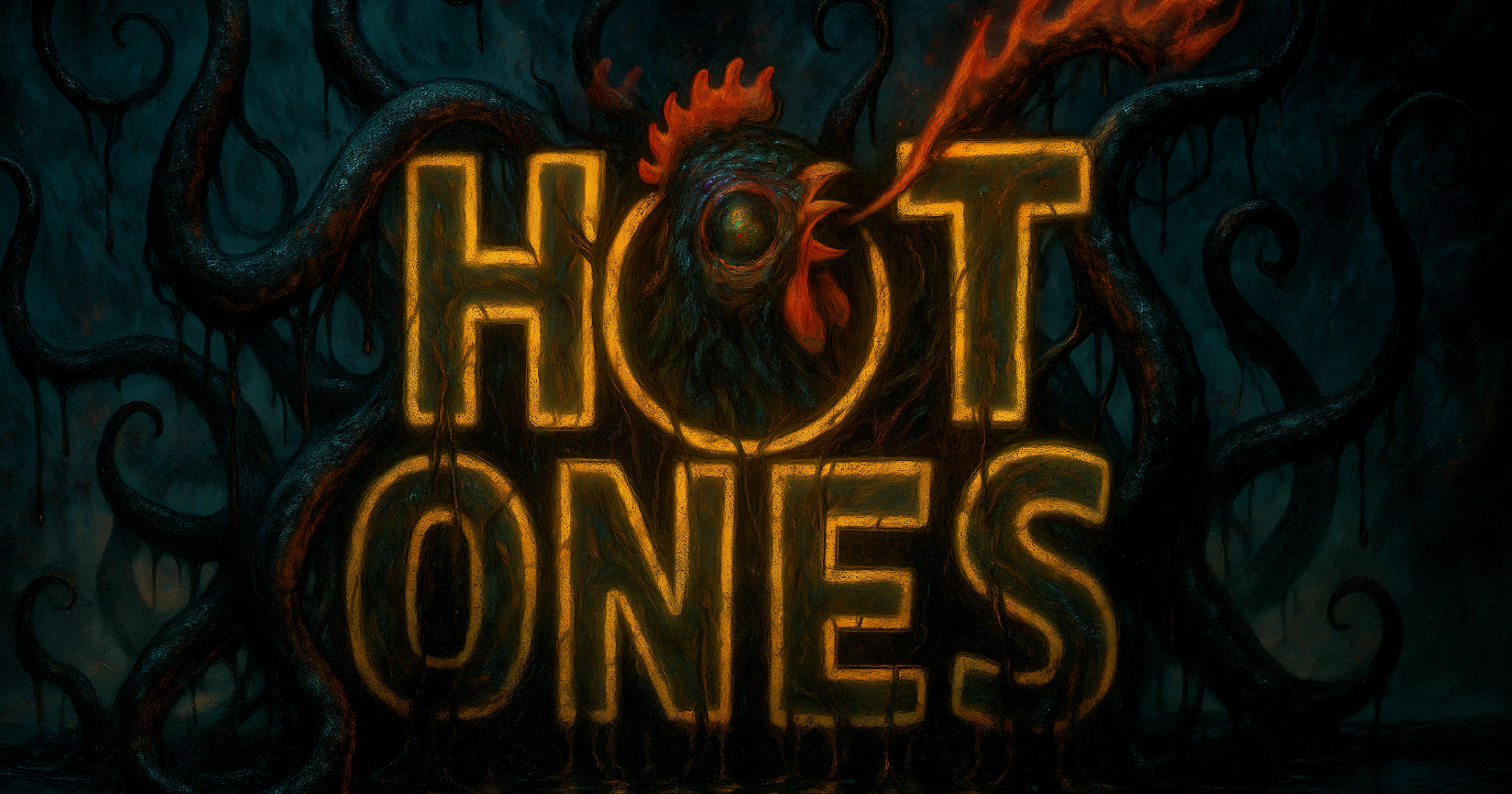 THE HEAT COMES FIRST, painted across the lens in a heavy red filter. Maraeth leans forward, one hand hovering over a half-eaten wing, the sauce clinging bright and angry to Their fingers. A sheen of sweat has found Them now, but the smile stays in place—steady, easy.
